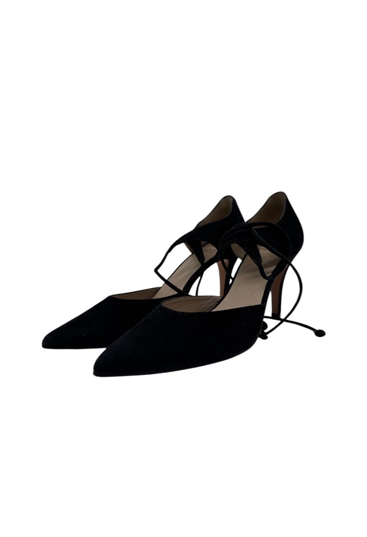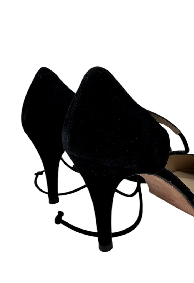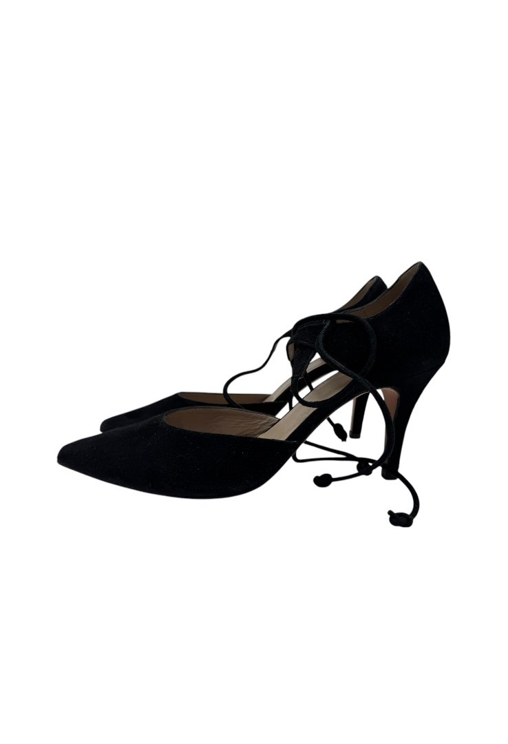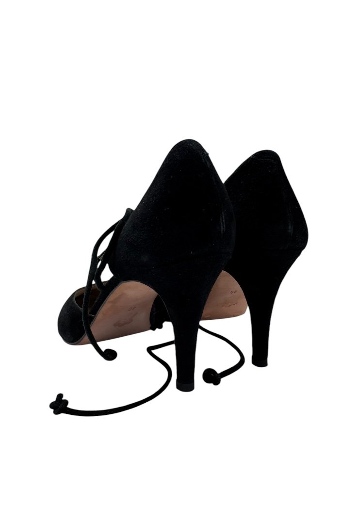 Zapatos de tacón de gamuza negros con punta triangular, cintas para amarrar.