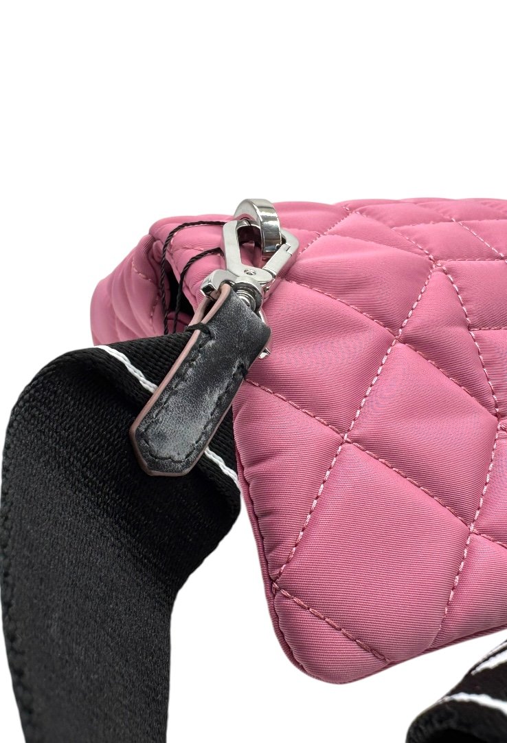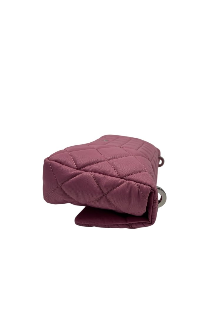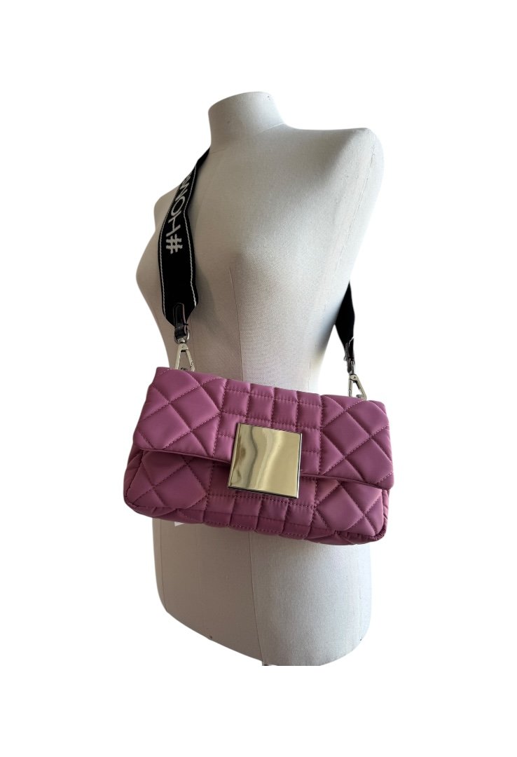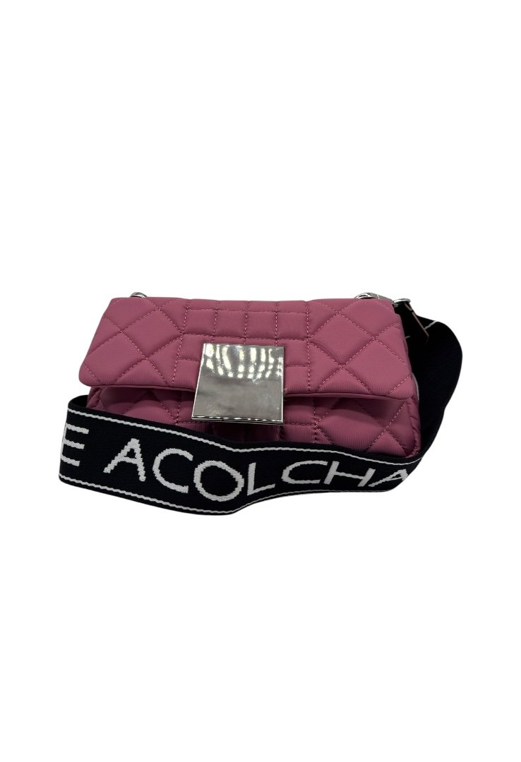 Bolsa fabricado en lona acolchonada, asa ajustable en negro, compartimento interno con cremallera, herrajes en plata.