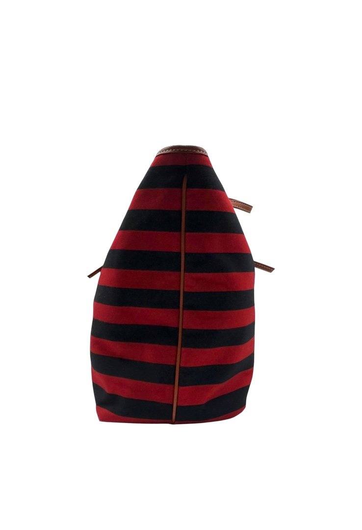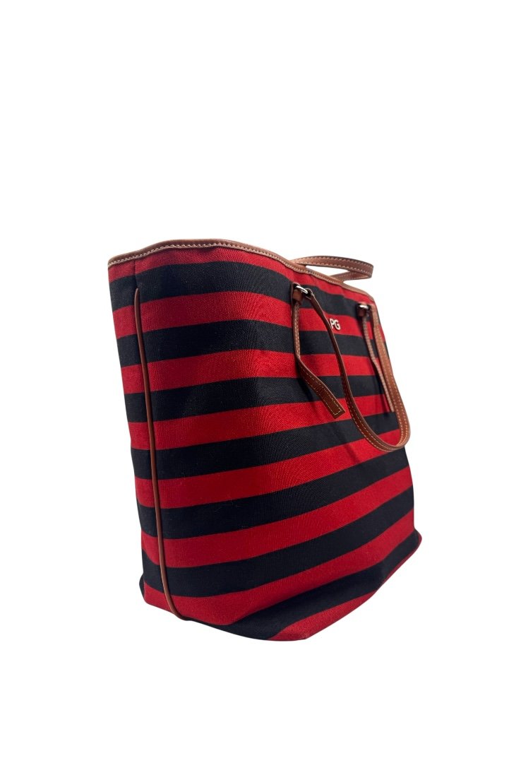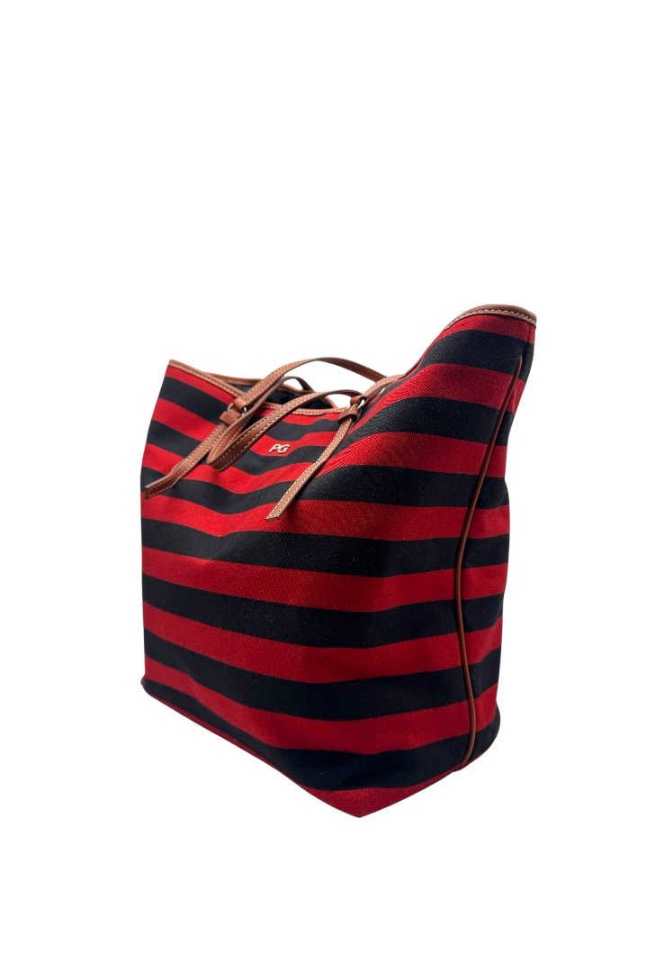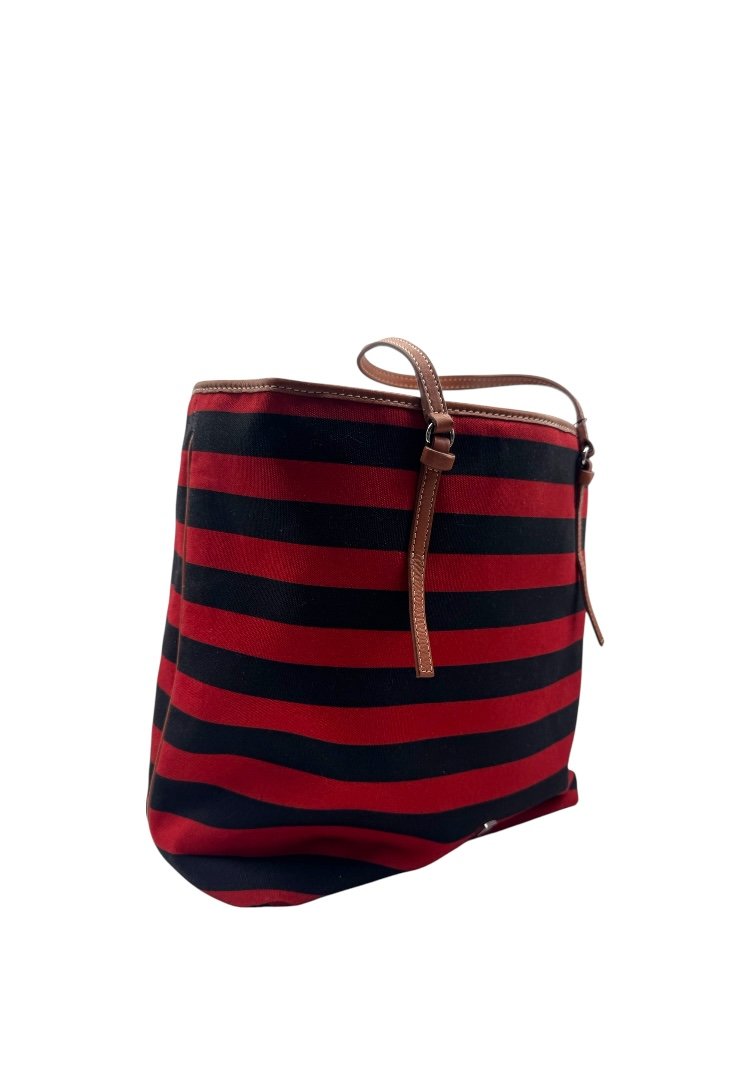 Bolsa en textil con diseño rayado en dos colores, asa en cuero, apliques en dorado, compartimento interno con cremallera.