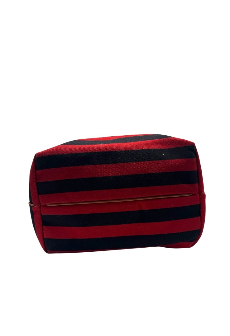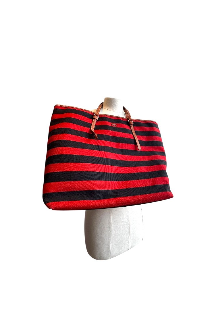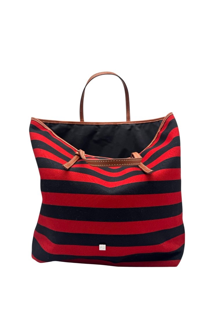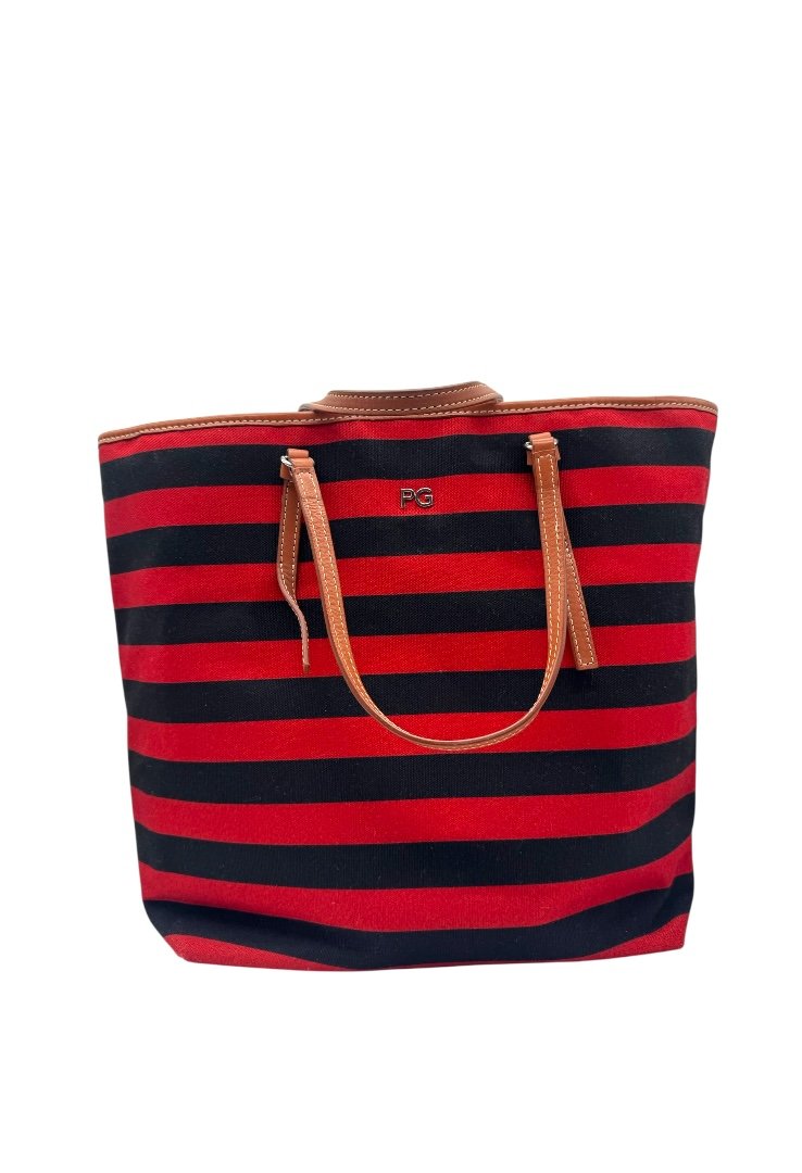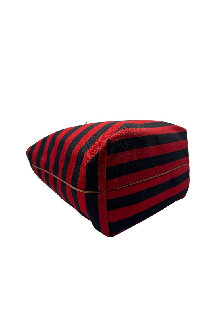 Bolsa en textil con diseño rayado en dos colores, asa en cuero, apliques en dorado, compartimento interno con cremallera.