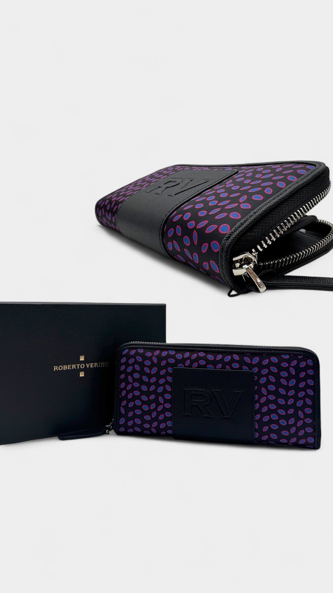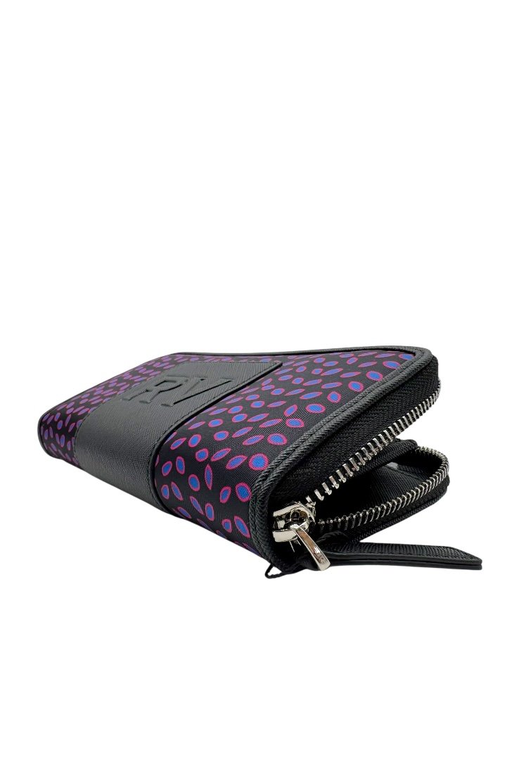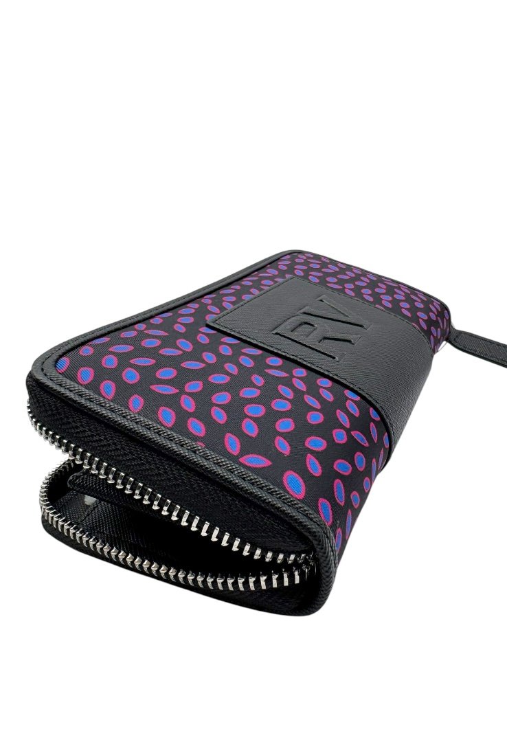 Cartera elaborada en textil con diseño contraste, letras de la marca en relieve, cierre de cremallera.