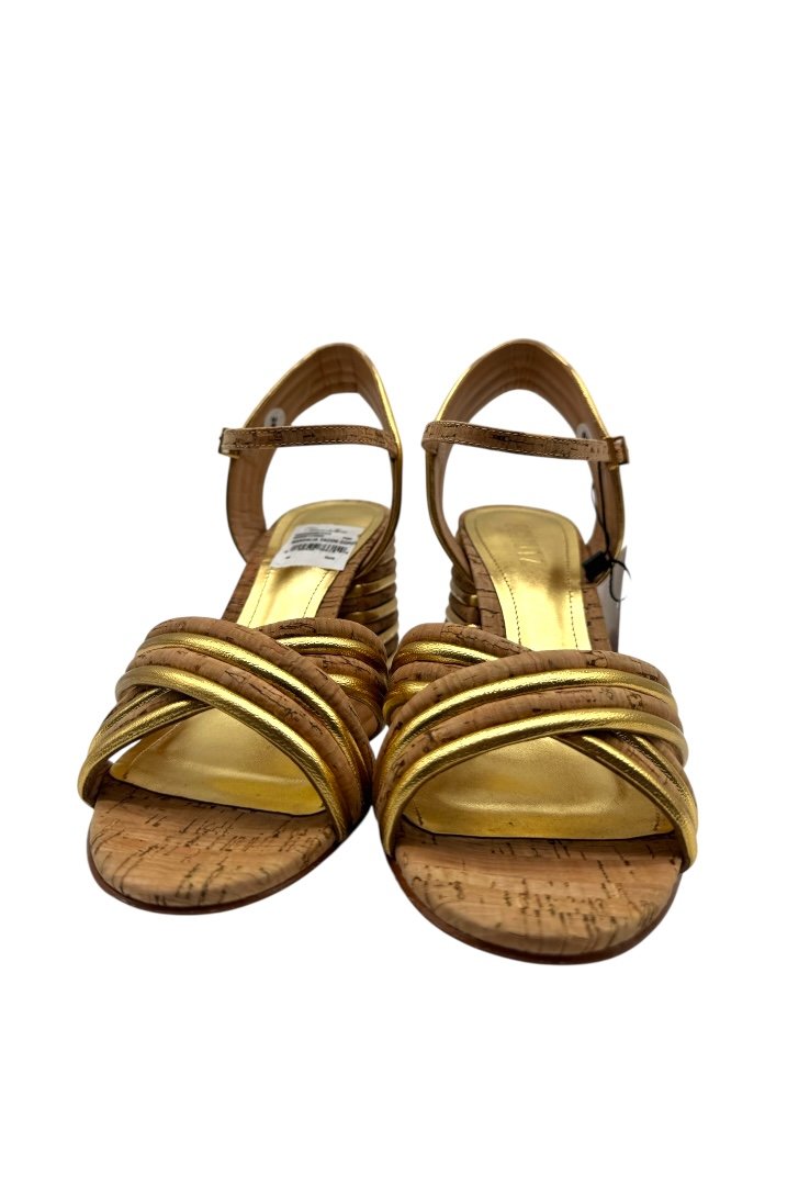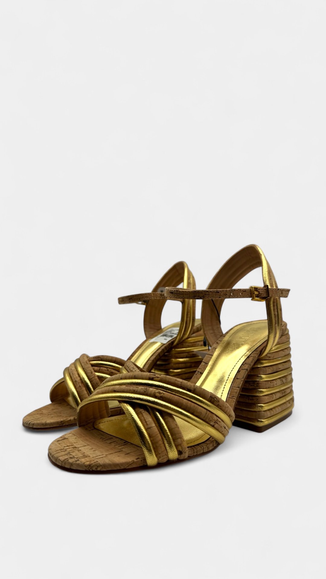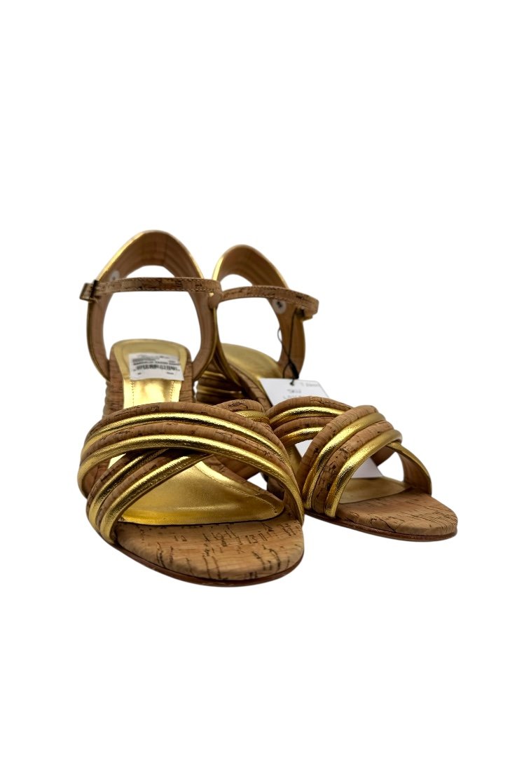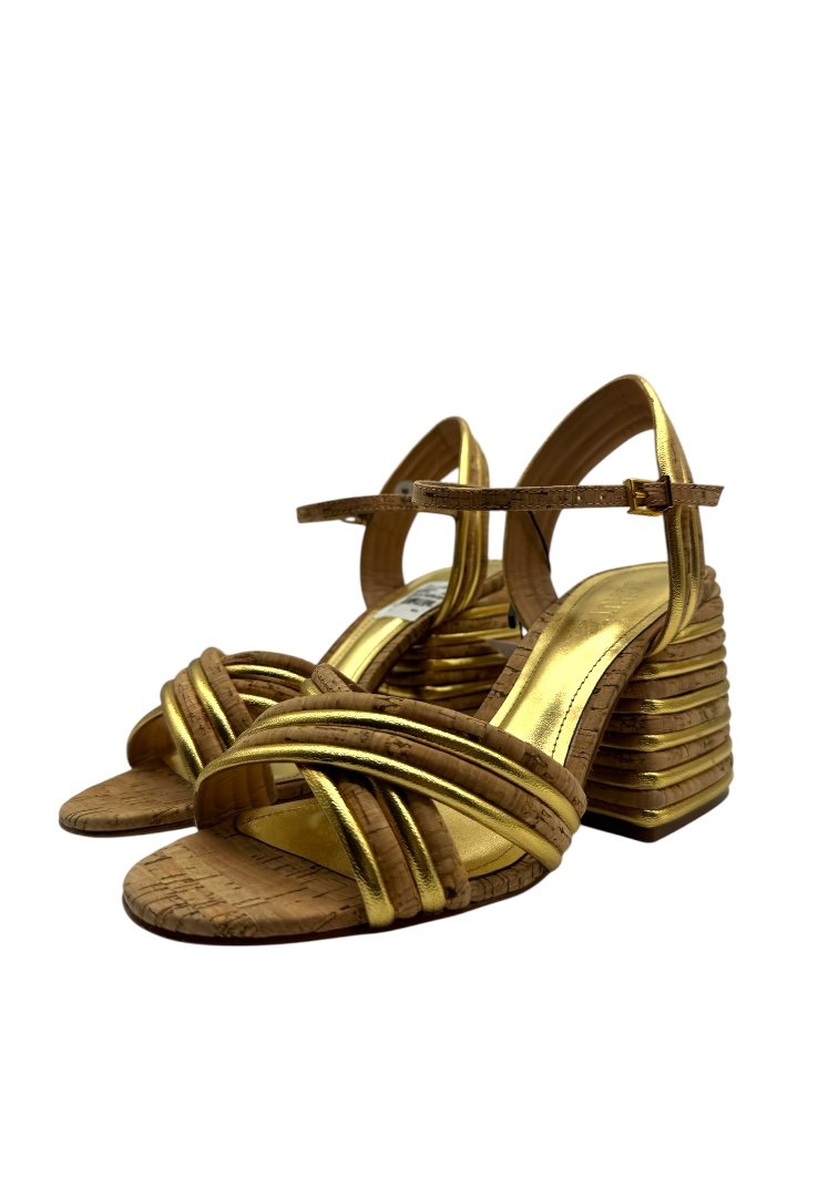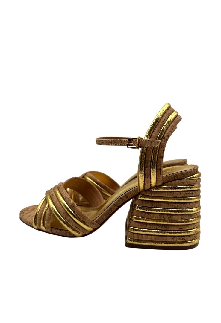 Sandalias de tacón, punta redonda, diseño intercalado entre corcho y piel sintético dorado.