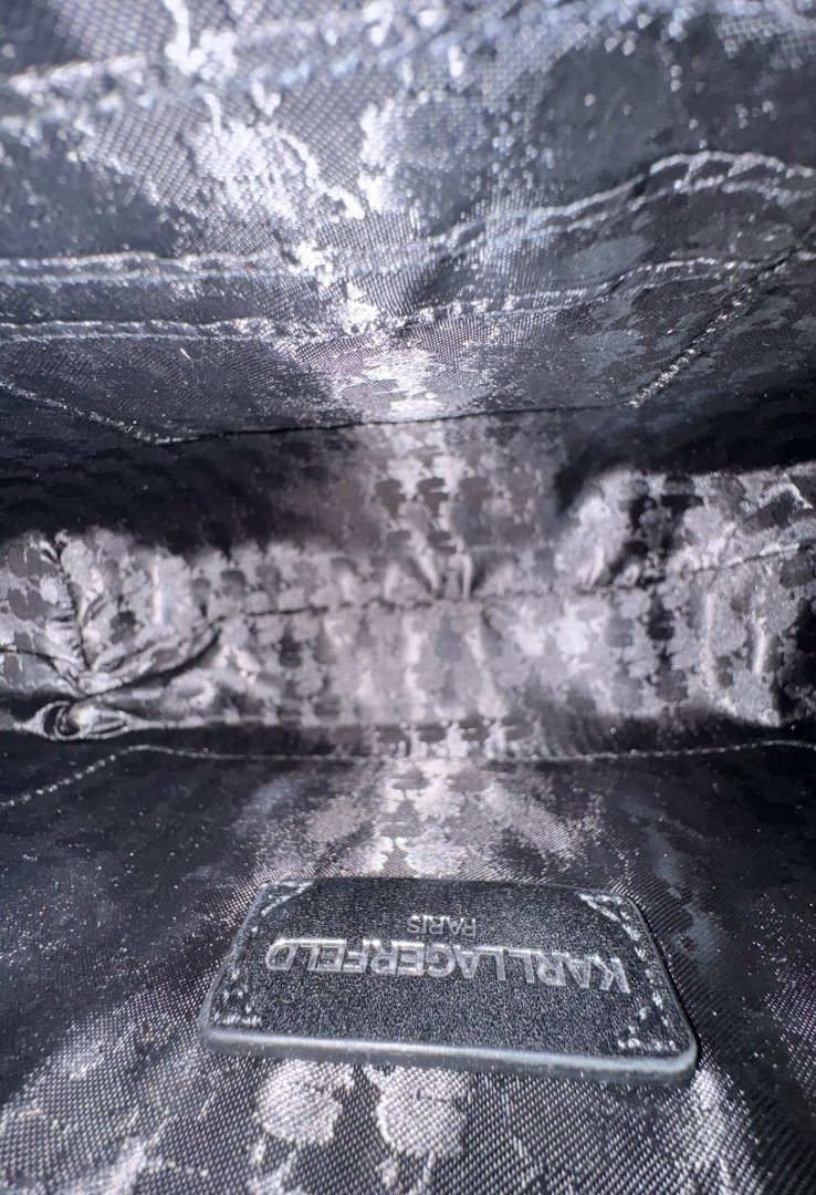 Hermoso bolso efecto laminado con losgotipo de la marca, cierre con cremallera, cadena de metal y bandolera metálica