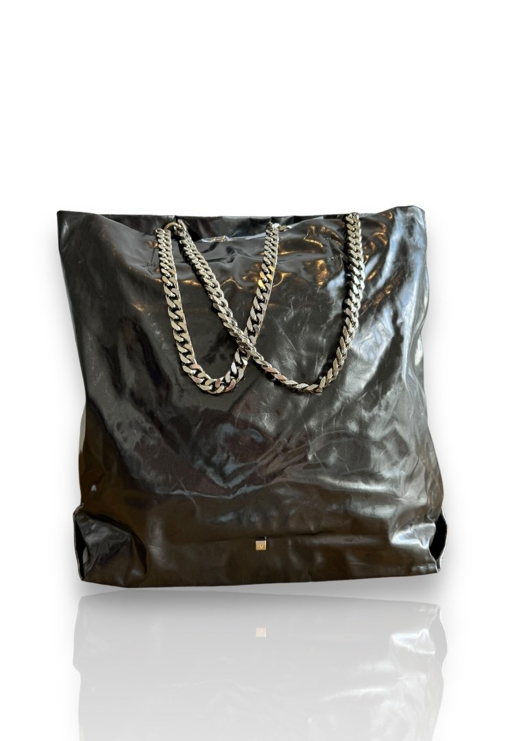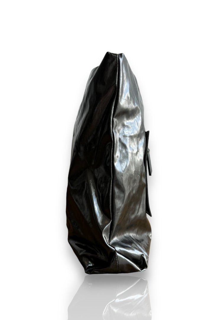Bolso de mano reversible en color gris metalico, doble asa dmetal en color plateado.