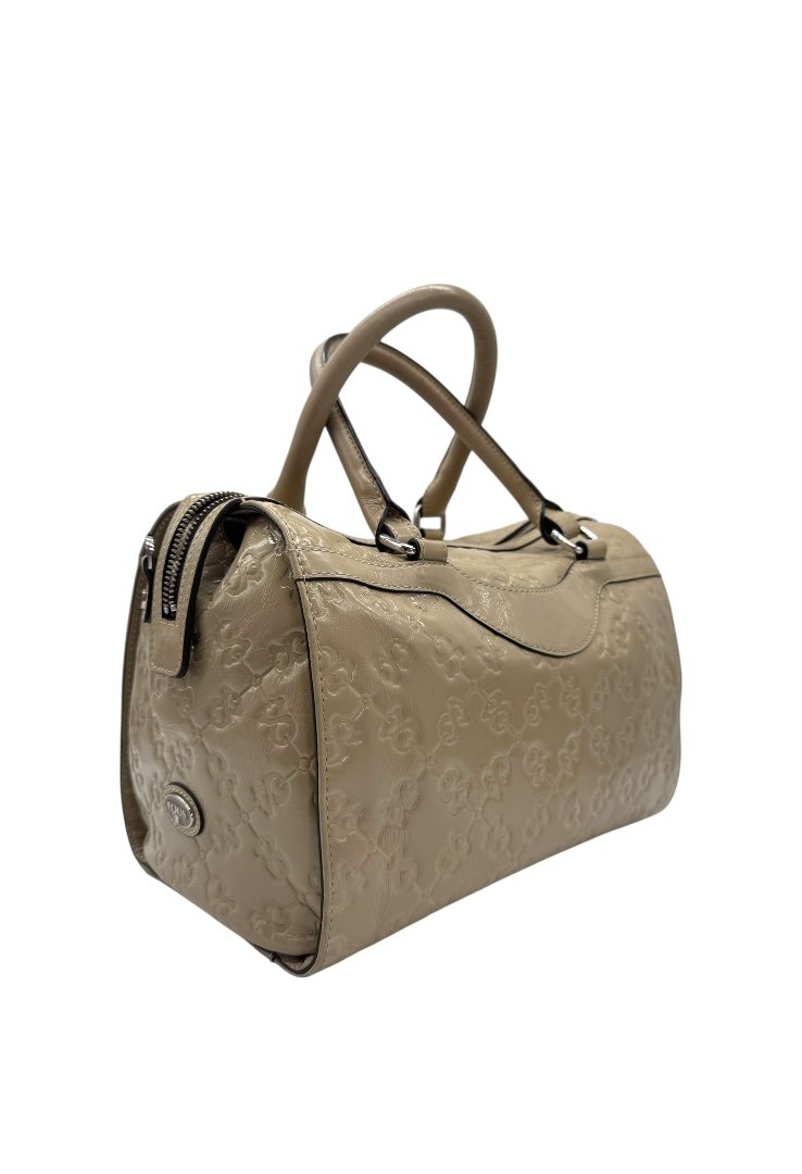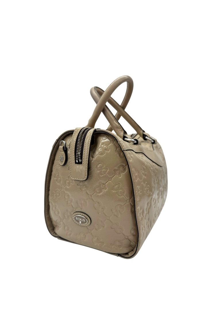 Bolso elaborado piel sintética con acabado charol, con grabado tipo cadena de .