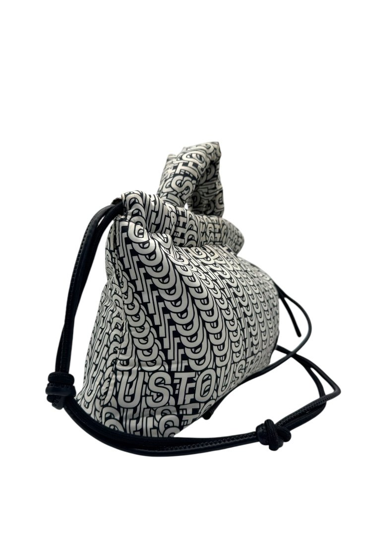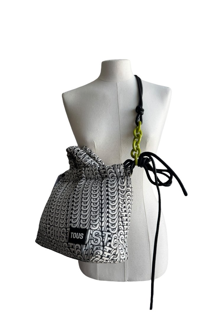 Elaborado en poliéster reciclado bicolor con diseño monogram, eslabones decorativos, cordones negros, nombre de marca a contraste . Cierre con botón magnético